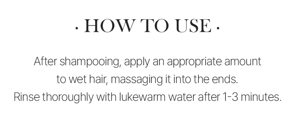 بعد غسل الشعر بالشامبو ، ضعي كمية مناسبة على الشعر المبلل بالتركيز على الأطراف بحركة تدليك ، اتركيه لمدة 1-3 دقائق ، ثم اغسلي الماء الفاتر.