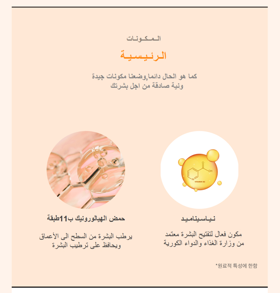 يحتوي على نياسيناميد، الذي يحسين حاجز البشرة و يعزيز ترطيبها، ويقليل