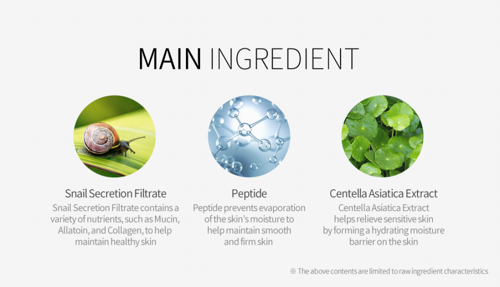 · يحتوي مستخلص الحلزون على خصائص علاجية وتجديد قوية ، ويساعد على التعامل مع مشاكل الجلد الخارجية (تهيج ، والتهاب ، وما إلى ذلك) ، كما أنه يعمل على المستوى الخلوي ، ويبدأ عمليات التعافي.